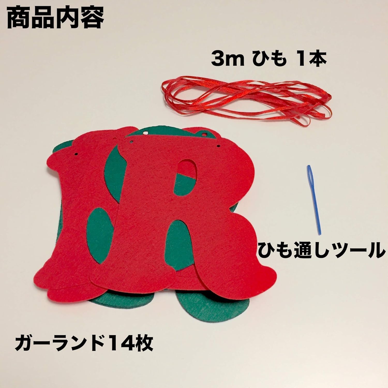 クリスマスのデコレーションにお使いいただけるMERRY CHRISTMASの文字のシンプルなガーランドです。 ガーランド上部のホールに紐を通すだけで簡単に作ることができます。 また、紐通しツールが付属していますので、ツールに紐を結んでホールに通すとより簡単です。 レッドとグリーンの2色の色がクリスマスを演出します。 ガーランドサイズ:1個約13~15cm ガーランドの数:14枚 紐の長さ:3m 作り方説明書、紐通しツール付属