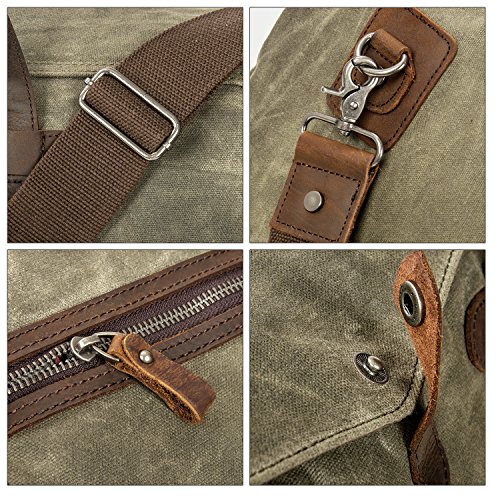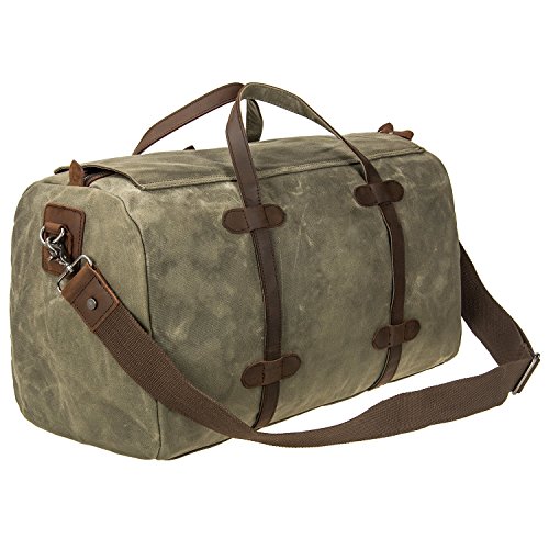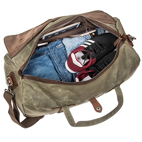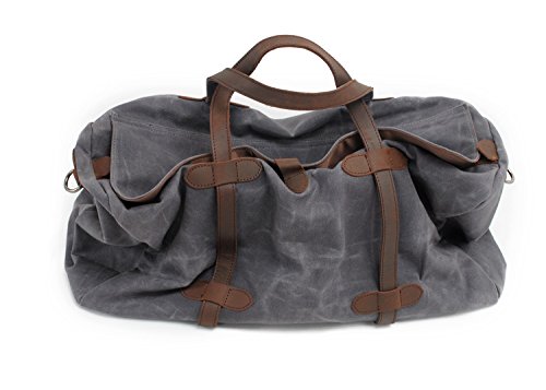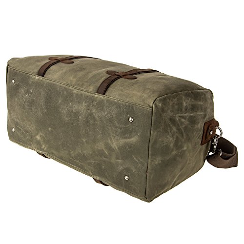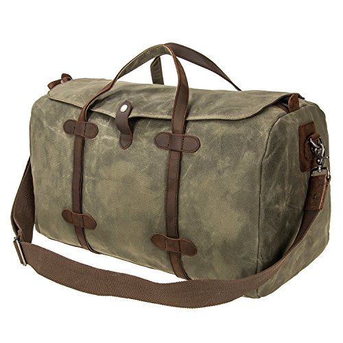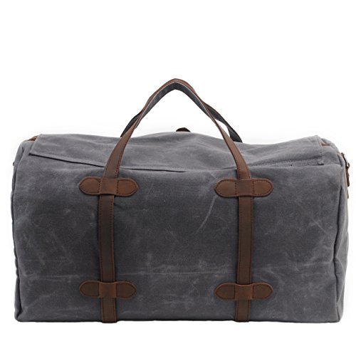 -. Feature : Material:DURABLE,Made of top quality waxed canvas (100% Water Repellent ),Genuine Leather Trim / Construction : Zipper Closure, 1 x large compartment, 1 x inner zipper pouch, 4 x inner wall pouch, Desighed with an adjustable and detachable shoulder strap. / Dimensions: 21.7 x 9.8 x 11.8 inches (55 X 25 X 30 cm)?(L*W*H),Weight: 3 pounds / Upgraded Craft : waxed canvas, Tear resistant and water repellent.This travel duffel is perfect for day-to-day use or occasional travel, and great gift for everyone. / INTENDED USE: Gym, Sports, Travel, Lage, Carry-on Bag, Hiking and Camping,Business Trip Comfortable and convenient to carry.Keep all your supplies dry .