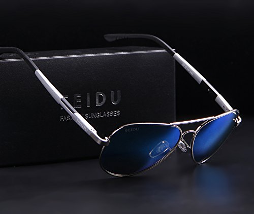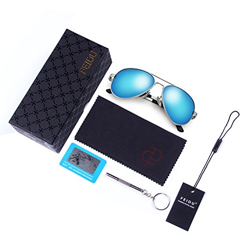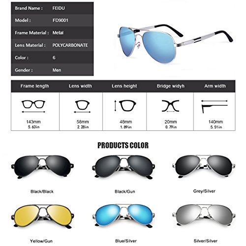 Lens Color black/blue/silver/grey Size Lens Width: 2.28'' Lens Height: 1.88" Frame Length: 5.62" Bridge Width: 0.78" Arm Width: 5.51" Package 1x Sunglasses 1x Soft Glasses Cloth 1x Spectacle Glasses Case 1x Screwdriver 1x Exquisite Packaging Carton FEIDU SUNGLASSES Style and Quality is what we convey to our customers. Make You Look Good with unique designs from FEIDU.It's cheap travel accessories,but not a look cheap sunglasses .Provide a high clarity vision in front of you to see clearly and more comfortably. FEIDU FD9001 Polarized SunglassesIt's Lightweight , Heavy-Duty, Shatterproof, gives you stress-free wearing experience.A mirror sunglasses necessary accessories in summer.Our aviator sunglasses is heavy duty and unisex,siutable some people want find women's sunglasses or aviator sunglasses for men . Features The Filter Category of these Sunglasses is 3: General Purpose Mirror Sunglasses. Purchase from WSUK with confidence that the glasses you receive are fully CE certified and 100% UV400 protective. 100% UV Protection Filter out 99% of reflected glare without haze or optical distortion. Protect your eyes and enjoy a high clarity vision more comfortably. 2017 Brand New Italian Design Aviator wrap around design. The fashionable sunglasses style on 2017 and selling on Amazon .Looks low-key but reveals your high-end taste and style .It's good accessorie sunglasses for men women . Suitable for Outdoor Activities Men and women alike, whether you're into driving, fishing, baseball, golf or other sport ,men women sunglasses is necessary, if you love this classic retro looks.Feature
