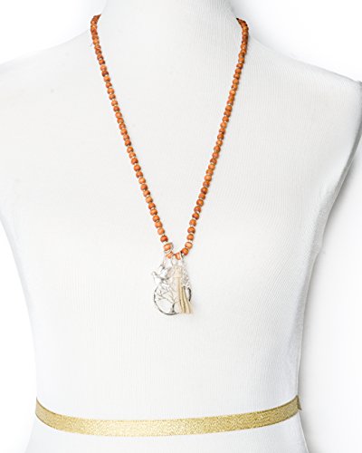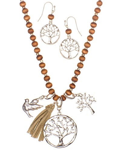 A long rosary wooden beaded necklace and earring set with polished silver-tone tree of life & bird pendant finished with a dangling faux leather tassle by Jewelry Nexus Jewelry Nexus is dedicated to introducing jewelry that fits the lifestyle of today's woman. Quality product and first-class customer service have contributed to our reputation. Jewelry Care Instructions: Don't wear your jewelry to bed. Please store your jewelry in a protective container and keep away from sunlight and moisture. For mild cleaning please use a Silver Polishing Cloth.Feature