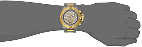 -. Feature : Chronograph functions with 60 second, 30 minute and 1/10 of a second sub dials; date window at 4:00 / Grey dial with silver tone, gold tone and white hands, gold tone and white hour markers; luminous; unidirectional 18k gold ion-plated stainless steel bezel; screw-down 18k gold ion-plated pushers and crown with security bar; flame fusion crystal; grey matte stainless steel case; grey polyurethane strap with 18k gold ion-plated stainless steel accents / Swiss-quartz movement / Case diameter: 50mm / Water resistant to 1640 feet