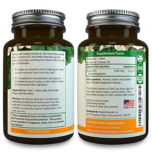 -. Feature : HELLO, WE'RE NESTED NATURALS. NICE TO MEET YOU. We're setting a new standard of honesty and transparency in the health supplements & nutrition industry by 3rd party testing every batch, only using the highest quality ingredients, and being socially conscious. Every product we make is designed to improve your health, happiness, and overall well-being - which is why our Sublingual Vitamin b12 is unlike any other. / HIGHEST BIOAVAILABLE FORM OF INSTANT B12: We use the methylcobalamin form of B12. Studies sest it may be easier for the body to use than the cheaper cyanocobalamin form which the body must convert. Taking B12 under your tongue sends the vitamin directly into your bloodstream - great for people whose stomachs lack the intrinsic factor needed to absorb B12 through the digestive tract. / IDEAL FOR VEGANS, VEGETARIANS & STRESSFUL LIFESTYLES: B12 is a natural energy booster that plays an essential role in helping the body convert nutrients from food into fuel. Lots of people are low in B12. Because almost no plants contain a high dose of bioavailable Vitamin B12, vegans and many vegetarians need to take a supplement to get their fill. People over the age of 65 have been found to be at increased risk of B12 deficiency. / CONVENIENT, EASY DISSOLVE VEGAN TABLETS: Other sublingual B12 supplements come in liquid form which isn't very convenient for on-the-go use. Our tablets that dissolve under the tongue are easy like Sunday morning. We've made a conscious choice to make our B12 100% vegan. We're proud that our dissolvable tablets contain no animal products. Nested Naturals Sublingual B12 is dairy-free, soy-free, egg-free and nut-free. It contains no barley, yeast, sugar or preservatives. / LIFETIME GUARANTEE OF QUALITY & CARE: We are relentless about sourcing the best, most pure, most ethically produced ingredients available. Every product you purchase from us ALSO helps improve the nutrition of a woman or child in need through our partnership with Vitamin Angels. Each batch is made with love and we never cut corners, ever. If for whatever reason, you aren't satisfied, we'll refund your money. There's no hitch, friend. Just email or call us.