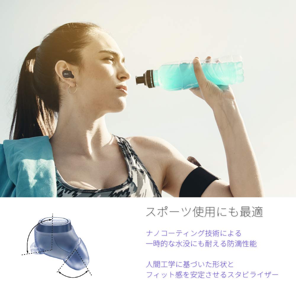 イヤホンのみで10時間の圧倒的な長時間音楽再生 ポケットサイズの小型充電ケース併用で合計50時間の音楽再生 完全ワイヤレスイヤホンとは思えない、明瞭でパワフルな低音再生 高音質コーデックのaptX 、AACに対応 Qualcomm最新チップの採用 左右の接続の安定化と低遅延を実現 防滴仕様、人間工学に基づいた形状でスポーツ使用にも最適