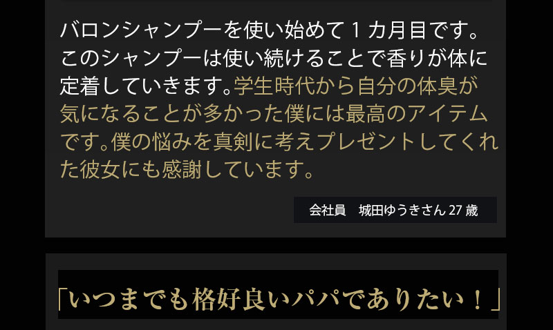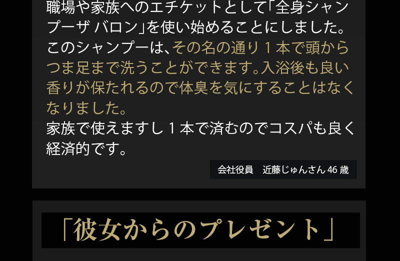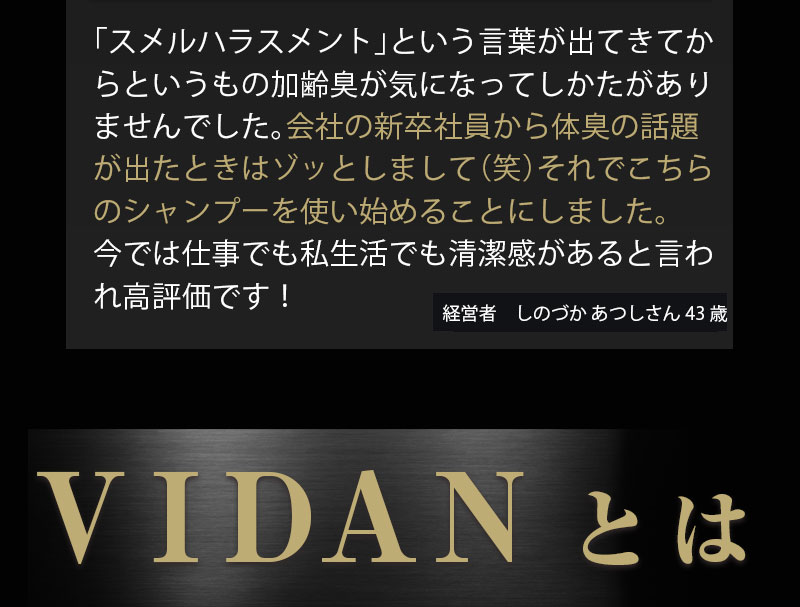 | 原材料名 | 水、ラウレス硫酸Na、コカミドDEA、コカミドプロピルベタイン、スルホコハク酸ラウリル2Na、香料、塩化Na、BG、フェノキシエタノール、ステアリン酸PEG-150、ラウロイルメチルアラニンNa、メチルパラベン、グアヒドロキシプロピルトリモニウムクロリド、メントール、クエン酸Na、EDTA-2Na、サリチル酸、ポリクオラニウム-10、クエン酸、シメン-5―オール、エタノール、ジラウロイルグルタミン酸リシンNa、フェノールスルホン酸亜鉛、カキタンニン、クロウミンTオウゴン根エキス、炭酸水素Na、チャ葉エキス、ボタンエキス、ヒキオコシ葉/茎エキス、炭酸Na、フユボダイジュ花エキス |