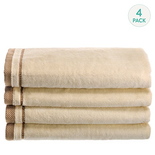 Creative Scents Cotton Velour Fingertip Towel, 4 Piece Set, 11 by 18-Inch, Cream With Embroidered Brown Trim