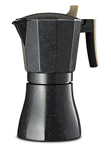 Material We use only top grade materials. The Moka pot is made from cast aluminum with a marbled finish The handle is made from nylon and fused with silicone. It is durable and flame retardant.