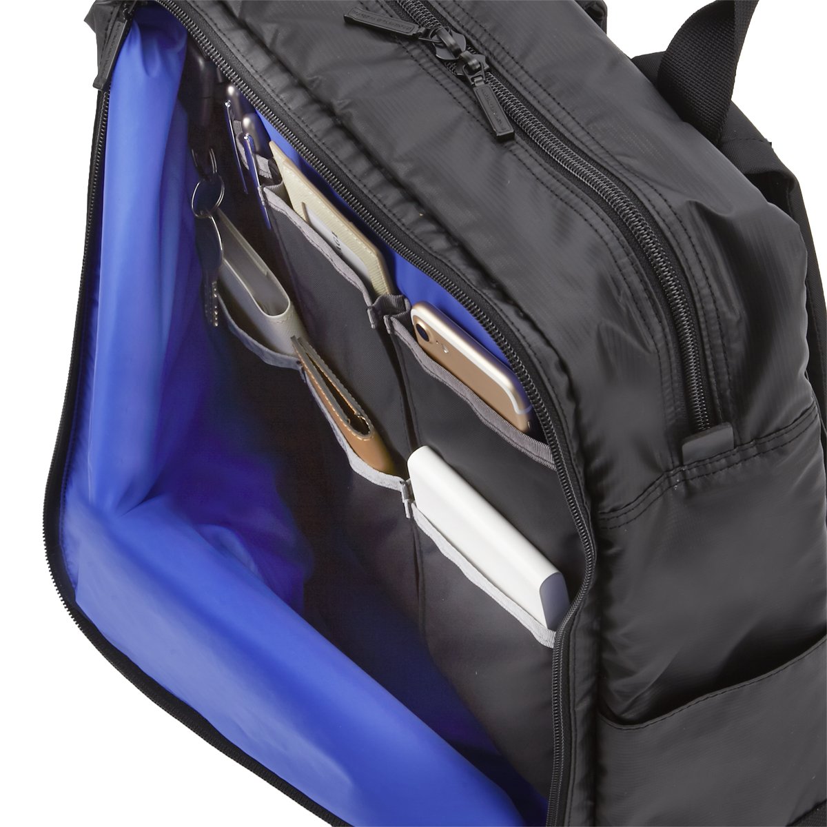 A two-step organizer (detachable key ring × 1, pen holder × 3, open pocket × 5) convenient for storing small items when opening the front L-shaped fastener