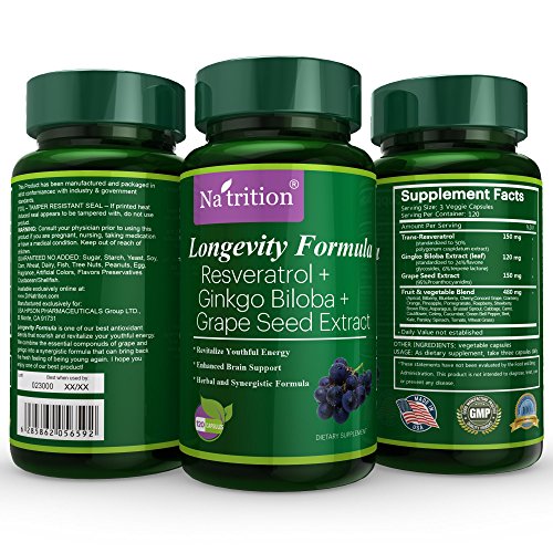 Na'trition Trans-Resveratrol Polyphenols with Ginkgo Biloba and Grape Seed Extract Herbal Supplement, 120 Veggie Capsules
