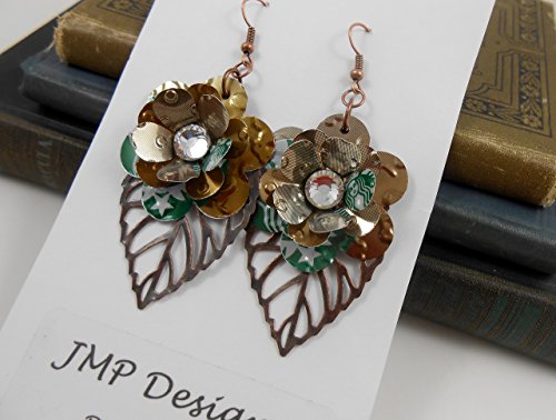 -. Title : Starbucks Mini Rose and Leaf Earrings. Recycled Soda Can Art.