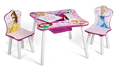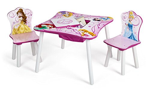 Create a space worthy of pint-sized royalty with this Disney Princess Table and Chair Set with Storage from Delta Children. Featuring colorful graphics of Disney's favorite princesses, the spacious tabletop with built-in storage in the center, and two coordinating chairs, makes tackling homework, crafting or snack-time so much easier.Feature