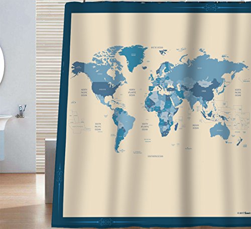 Sunlit Designer New World Map Quality Fabric Shower Curtain with Countries and Ocean - Blue and Beige