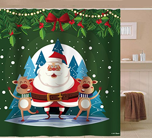 Sunlit Happy Santa Claus Waterproof Fabric Polyester Shower Curtain 72"X72"-Bathroom Decor Festive Cartoon Curtain Reindeers Christmas Ornaments Print Snow and Chirstmas Tree Home Decor Red Green