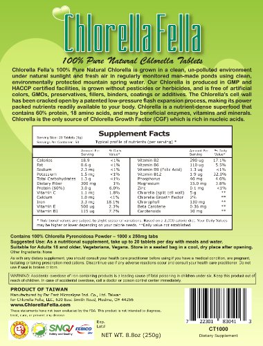 -. Feature : Please Note: The ChlorellaFella does not authorize any Amazon.com resellers. To be sure you are buying fresh, brand new products directly from the one and only Chlorella Fella source, look for "The Chlorella Fella" under "Shipped from and sold by" or "Seller Information." Any others are reselling our products second hand, and we cannot guarantee quality, freshness, accuracy, service, etc., or be responsible for any of our products being resold second hand. / 100% Pure Natural Chlorella Tablets from Taiwan's Premier Microalgae Manufacturer. No pesticides, herbicides, artificial colors, preservatives, fillers, binders, coatings or additives. Just 100% Pure Chlorella! / Nutrient-dense superfood made up of 60% protein, 18 amino acids, and various vitamins and minerals. Product of Taiwan, member nation of PIC/s. Shipped from USA. SHIPS FREE WITH TWO OR MORE! / High quality sun-grown chlorella, produced with environmentally protected mountain sP.R.Ing water in a GMP and HACCP certified environment, manufactured under ISO 22000:2005 quality management system. / Our Chlorella's cell wall has been cracked open by a patented low-pressure flash expansion process.