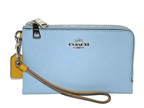 -. Brand : -. Color : Blue / Yellow -. Department : womens -. EAN : 0889532106103 -. Feature : Crafted of 's pebbled leather in the Colorblock design with one compartment a lovely light blue and the other sunflower yellow. / There is a handy sunflower yellow leather wrist strap with a polished nickel swivel type clip that can also be attached to the inside of your handbag. / Lined with 's signature sateen/cotton blend material in a coordinating color. / There are two multifunction pockets and the signature leather creed patch in one compartment. The other compartment is roomy and perfect for your cell phone! / Measurements: 6 ½" (L) x 4" (H) x 1 ¼" (D) -. Model : 64799 -. ProductGroup : Shoes -. ProductTypeName : HANDBAG -. Title : Colorblock Double Corner Zipper Blue Sunflower Yellow Leather Wristlet, 64799 -. UPC : 889532106103