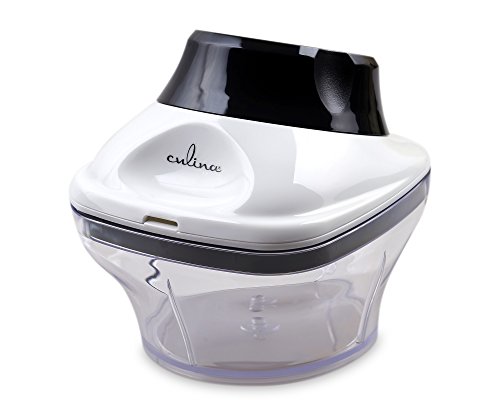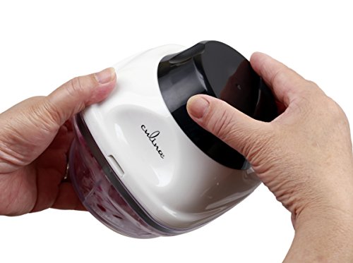 -. Feature : Product Dimensions - 9.7 x 5.3 x 5.1 inches. 3 parts: 1 clear bowl, 1 lid with chopper operating twist mechanism and 3 sharp metal blades for a swift, reliable, clean cut. Not soggy or "juiced." / Chop, slice, dice or mince effortlessly with virtually no contact with the food: simply place chunks in chopper and twist the cap to engage blades. Ideal hand chopper! / Compact size gets you approx. 1 1/2 to 2 cups of chopped ingredients fast. Makes for easy in-drawer storage too. Save time, space and energy. / Man-powered tool, tough built for utilitarian use by pro chefs or home-cooking aficionados. Hand wash to preserve blades sharpness. Dishwasher safe. / 100% Culina Satisfaction Guarantee