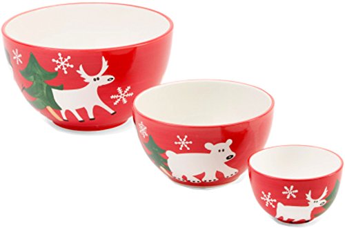 222 FIFTH Arctic Holiday Glazed Ceramic Mixing Bowls-3-Piece Set, Red