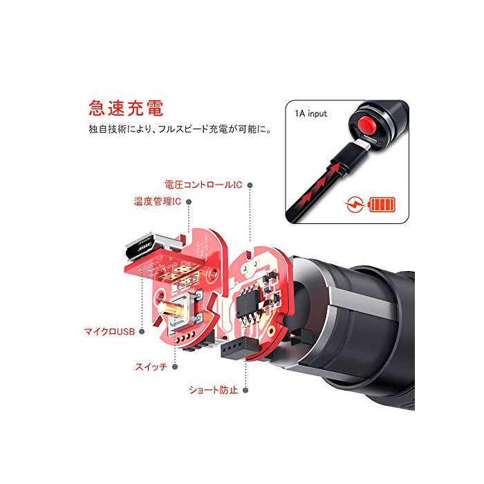【재질(본체)】PMMA TIR렌즈 탑재 / 신축 스트랩 / 테일 스위치 (스위치의 개폐 내구 횟수의 기준은 20,000회,타사 제품의 약2배) / 군용 레벨의 양극 처리를 한 항공기용 알루미늄 합금(1.5m부터의 낙하 시험을 합격) / 18650 배터리 내장(전지 교환 불요) / 멀티 프로텍트 시스템을 탑재.