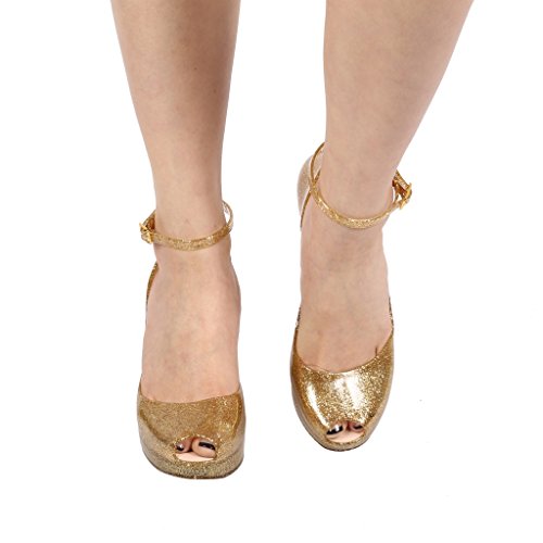 - Feature : Jelly PU material upper / PU lined insole / Manmade outsole / Measures 4 inch heel on a 1 inch platform