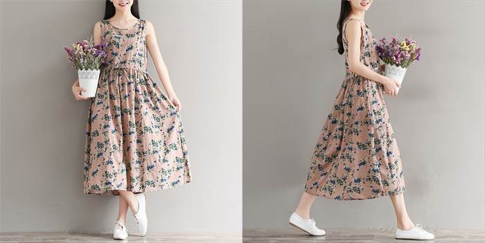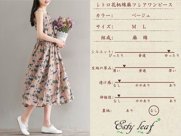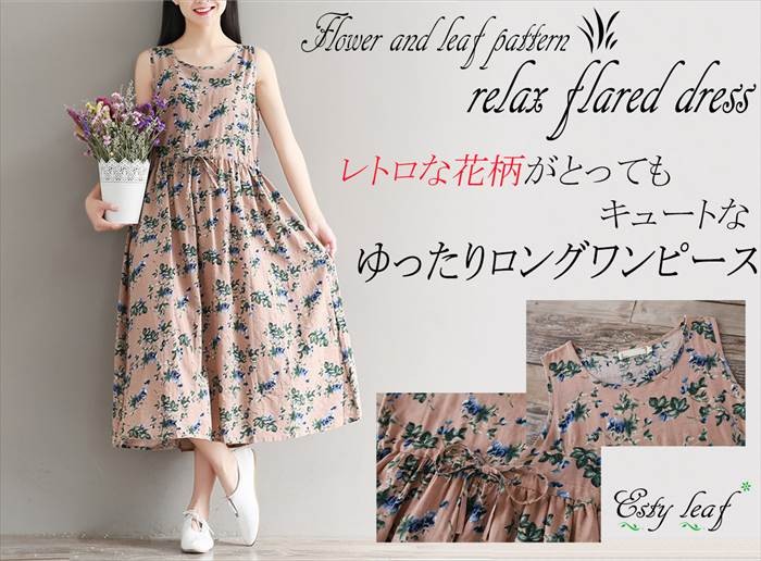 ・レトロな雰囲気漂う花柄プリントがお洒落で可愛い、ゆったりシルエットのノースリーブワンピース。・麻混のサラッとした素材を使用し、着心地はとっても軽やか♪・お色はややピンクがかったベージュなので、甘くなり過ぎず、女性らしい雰囲気に。・ウエストで生地が切替になっており、たっぷりとギャザーを施す事でキレイなドレープラインを演出。・裾に向かって広がるAラインシルエットで、女性らしいエレガントな印象を与え、体型カバーもバッチリ♪・カーディガンとも相性も良く、コーディネート次第でロングシーズンお楽しみ頂けます。●サイズ展開 【M】着丈110cm バスト90cm 肩幅33cm 【L】着丈111cm バスト92cm 肩幅34cm ※平均での採寸となりますので、多少の誤差が生じる場合がございます。ご了承くださいませ。●カラー展開 ベージュ●商品詳細 【素材】:コットン・リネン 【透け感】:ややあり 【厚み】:やや薄め【裏地】:なし 【シルエット】:ゆったり 【伸縮性】:なし【付属品】:なし (コーディネート使用の衣類、アクセサリー等は付属しません)20代 30代 40代 50代