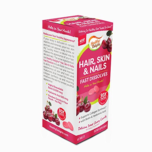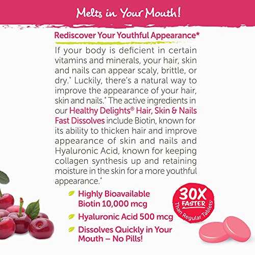 Add to your diet the precise balance of essential nutrients you need to support your hair, skin and nails while enjoying a delicious cherry candy treat. With Hyaluronic Acid, a highly bioavailable form of biotin and a fast-acting, fast dissolve form, Healthy Delights Hair, Skin & Nails goes to work quickly in your body to help thicken hair, improve appearance of nails and help your skin retain moisture for a more youthful appearance.* One taste and you will wish all high quality vitamins and supplements tasted this