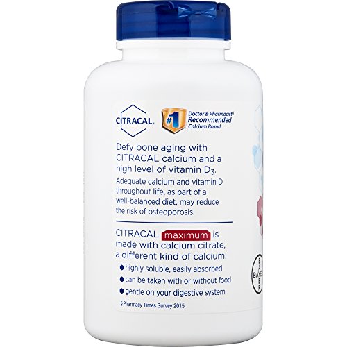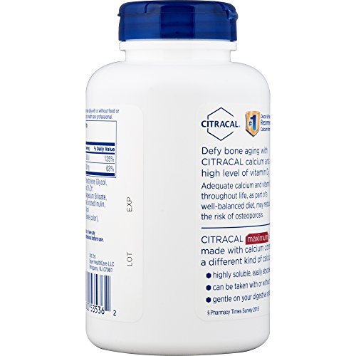 Citracal Maximum provides a combination of 630 mg calcium citrate and 500 IU vitamin D3 for strong bones.* These sugar-free coated caplets make it easy to include calcium and vitamin D in your osteoporosis prevention regimen.** It may not be possible to ingest enough calcium through food sources alone, and that's where Citracal Maximum comes in. Specially formulated, this supplement can be taken with or without food. It's gentle on your stomach and easily absorbed plus vitamin D3, which helps your body absorb calcium. This product is recommended for adult men and women, ages 19 to senior. Add Citracal Maximum to your diet and exercise routine to help support bone health now.* *This statement has not been evaluated by the Food and Drug Administration. This product is not intended to diagnose, treat, cure, or prevent any disease. **Adequate calcium and vitamin D throughout life, as part of a well-balanced diet, may reduce the risk of osteoporosis.Feature