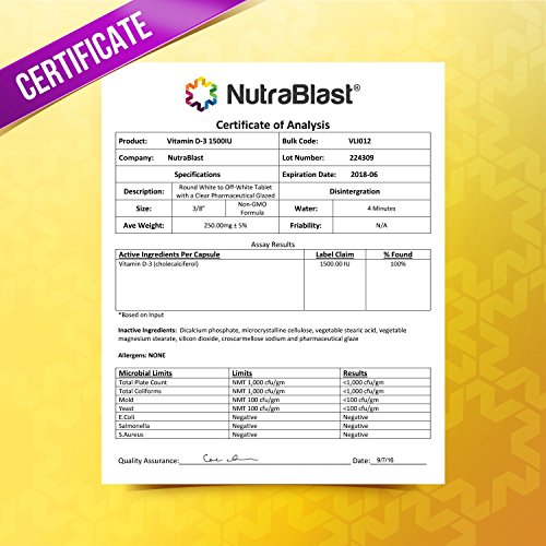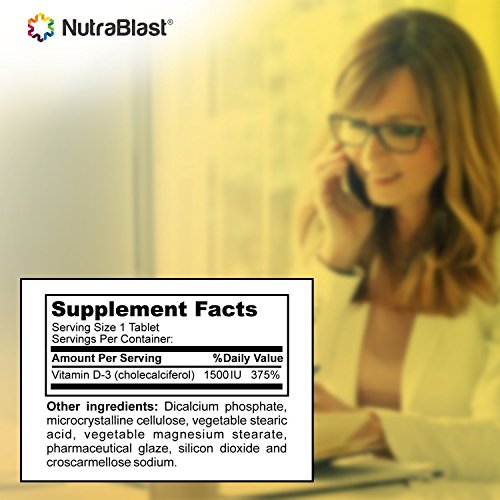 NutraBlast Vitamin D3 1500 IU - 100 tablets Fighting Vitamin Deficiency Vitamins help our bodies to function in many ways. When we are lacking in something, the signs often make themselves evident. Vitamin D deficiency is one of the most prevalent today. This is partially because this vitamin is absorbed from the sun, and many people spend most of their time indoors for one reason or another. The symptoms of this kind of deficiency may include bone pain and muscle weakness. Vitamin D also affects serotonin, the hormone that is responsible for positive feeling. The Right Vitamin for the Job Support these negative effects of a deficiency with NutraBlast Vitamin D3, which delivers your daily does in one pill. Highly bioactive D3 allows your body to get the most out of the vitamins, absorbing them quickly and efficiently tablets are easy to take for any comfort level 100 tablets per containerFeature