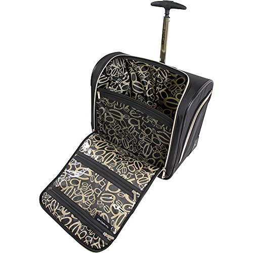 -. Binding : Apparel -. Brand : bebe -. Department : unisex-adult -. Feature : U-Shaped main compartment allows easy access to all your travel items / Internal mesh divider and 2 see-through compartments are perfect for toiletries and make-up / 6 external pockets for quick access to smaller items and to keep your organized / Adjustable push button trolley handle for easy travel / 15.5x8.5x15 -. Label : Fila Lage -- Dropship -. Manufacturer : Fila Lage -- Dropship -. PackageQuantity : 1 -. ProductGroup : Apparel -. ProductTypeName : LAGE -. Publisher : Fila Lage -- Dropship -. Studio : Fila Lage -- Dropship -. Title : BEBE Leena-Wheeled Under the Seat Carry on Bag