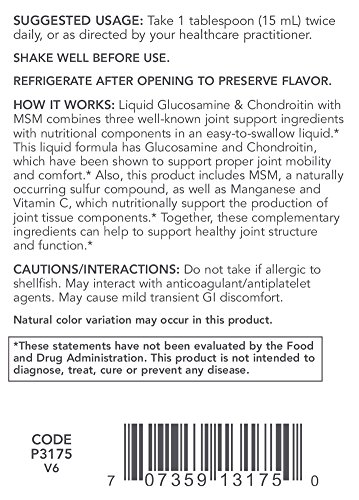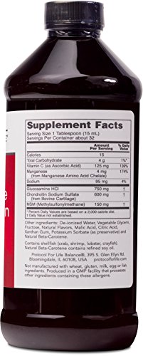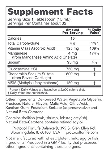HOW IT WORKS: Liquid Glucosamine & Chondroitin with MSM combines three well-known joint support ingredients with nutritional components in an easy-to-swallow liquid. This liquid formula has Glucosamine and Chondroitin, which have been shown to support proper joint mobility and comfort. Also, this product includes MSM, a naturally occurring sulfur compound, as well as Manganese and Vitamin C, which nutritionally support the production of joint tissue components. Together, these complementary ingredients can help to support healthy joint structure and function.*Protocol For Life Balance® is an A-rated GMP manufacturer of pharmaceutical grade dietary supplements created for healthcare practitioners. Our product line is comprised of effective, science-based formulations intended to address common nutrient deficiencies and support healthy physiological function. These formulations are based on the latest advances in nutritional science and incorporate trademarked ingredients of the highest quality. Our serving sizes are based on doses used in clinical trials and other published data, and the ingredients used in our products have been tested for efficacy in clinical trials and laboratory studies.