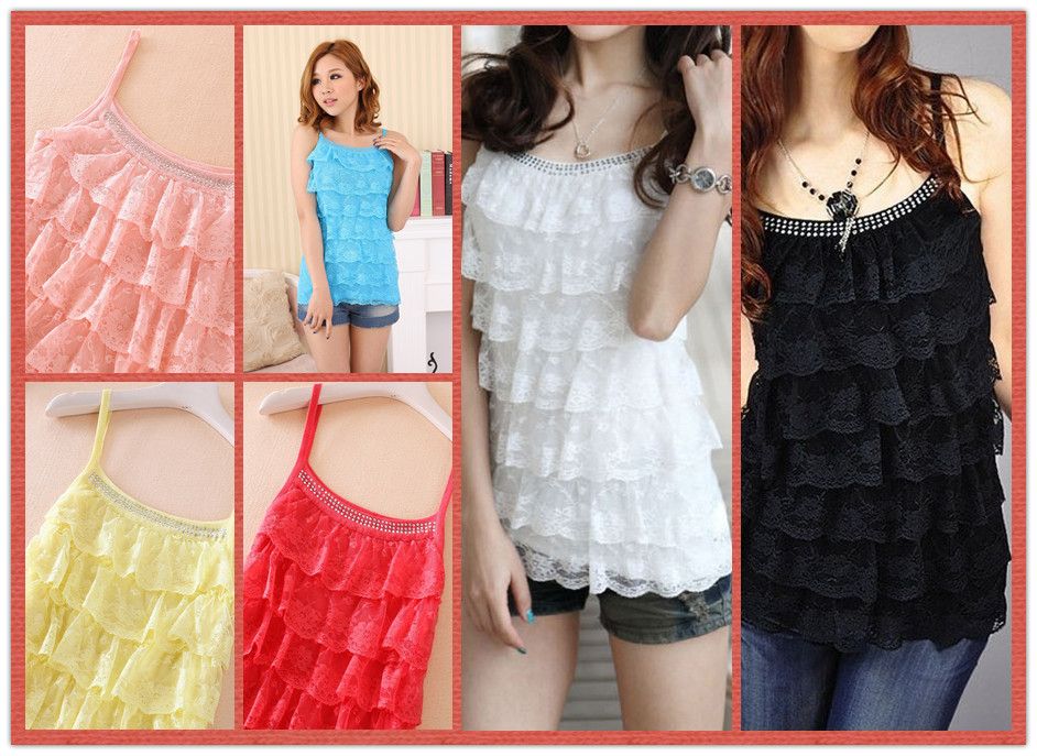 Sexy camisole top with rhinestone and the design of cake layers to be used as the bottoming top for all girls.