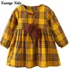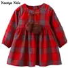 Kseniya Kids Brand Red Yellow New Autumn Girls Clothes England Style Plaid Fur Ball Bow Design Baby Girls Long Sleeve DressUSD 16.00-17.50
