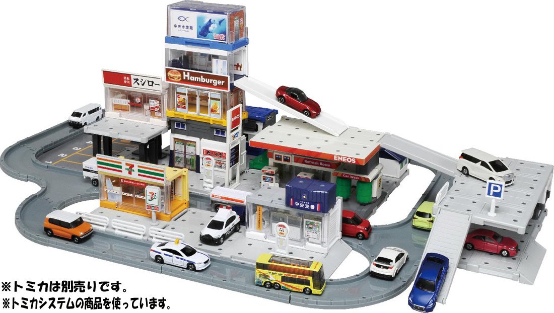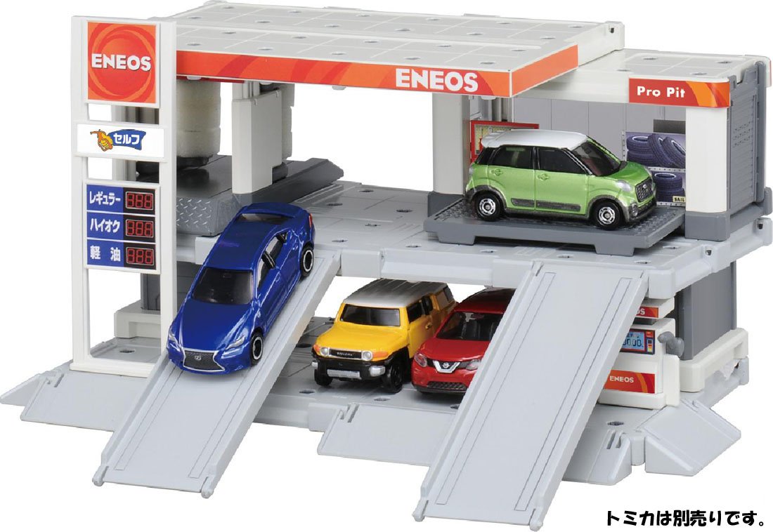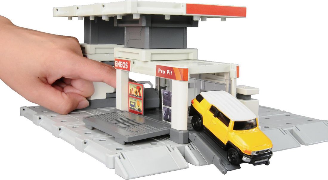 In the gas station, you can play action like the refueling machine that the refueling nozzle acts, the car wash machine that can roll and play, the real Tomica play can be done in the maintenance space, the push type departure equipment slope, etc.