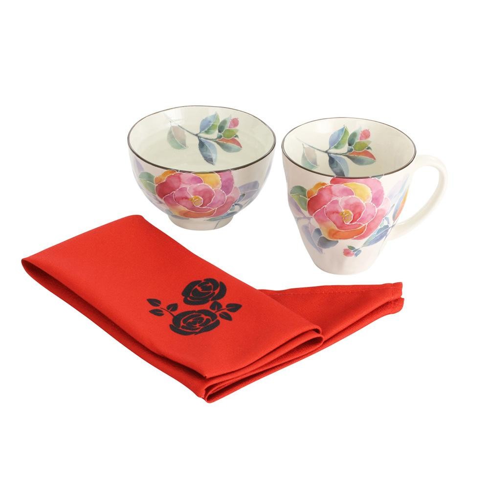 | サイズ | マグカップ:Φ9×H8.9cm、飯碗:Φ11×H6.6cm、東袋:39.5×38.5cm 個装サイズ:12×24×10cm |