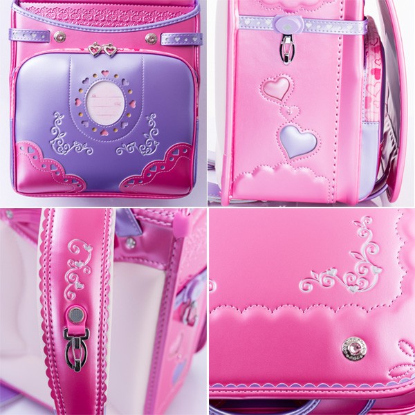 内装:ピンクドット、錠前:ワンタッチロック、補強:ガッチリガード、ポケット:ワイドポケット・内装総内張り・小ナスカン付、肩ベルト:ふわりぃ仕様・長尺・9穴・フリル型・箔押し・右(ハートカン)・左(小ナスカン)、鋲:クリスタルサークル、ナスカン:反射材付、冠裏:レース&ドット、反射材:冠下部・前締め・肩ベルト、固定型持ち手、カラー:パールピンク×パールラベンダー