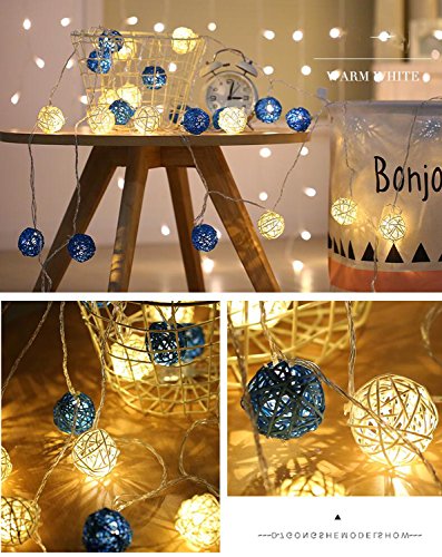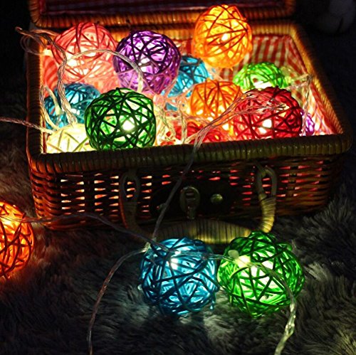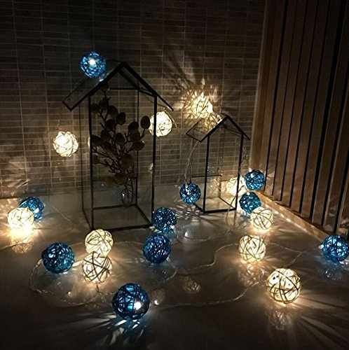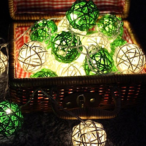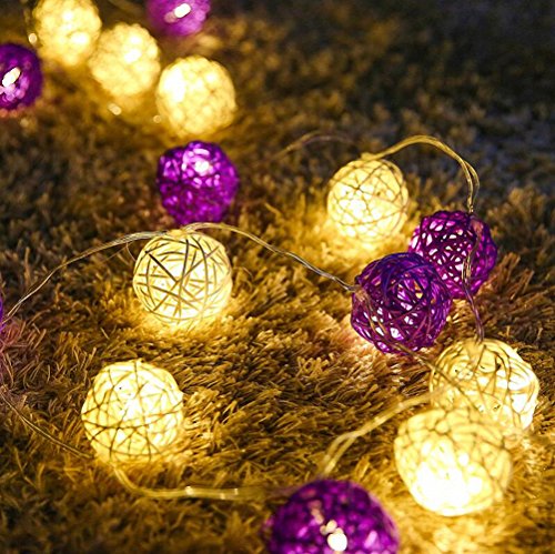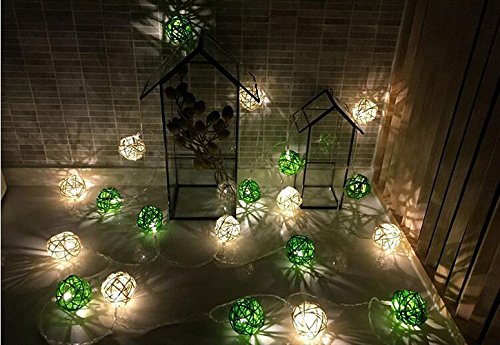 -. Feature : Totally 10ft/3m long, battery-powered, requires 3 AA batteries(not included), the LED lights are not replaceable. Safe and low voltage for daily use in your home. / 20 Rattan Ball LED string light are included. The diameter of each globe is 1.6 inch. / PREMIUM QUALITY STRING LIGHTING: The waterproof grade of the battery box is IP44. 20 LED rattan ball lights are of good heat management, providing a longer lifespan. Measures 10 feet in length long enough for your decoration. / Two light modes in one light strip you can choose: steady on and flashing regularly. The cozy warm light bulbs are similar to common incandescent light, but NOT bright enough to be used as general lighting. Generally used for parties, stage, wedding, bedroom, night scenes and other decorations, creating a warm and romantic atmosphere. / The light Strings is the excellent decoration for Christmas Gift. You can install them anywhere, not only on your home. You will be able to benefit of their light nature effect on holiday, celebrations, weddings to enhance the flower bouquets, tables, and ceilings. Traditional Holidays like Halloween, Christmas, Valentine's, Mardi Gras, custom parties, fourth of July, cannot be without the strings lights. Your home decoration will become alive. It can be able to make beautiful crafts too.
