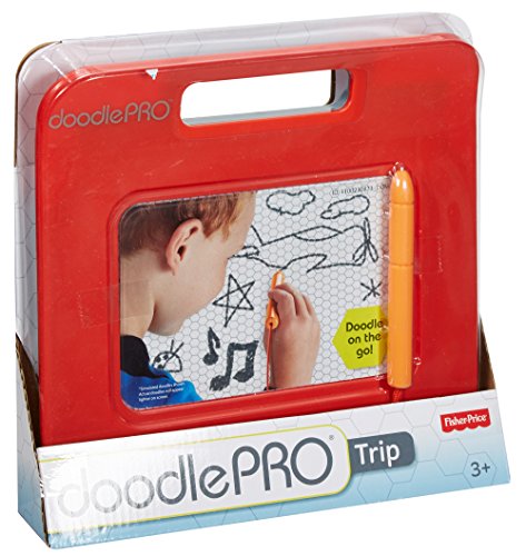 On-the-go doodling fun! The sleek & slim Doodle Pro Trip is sized just right for on-the-go, mess free, magnetic drawing fun! The screen saver pen is attached so it can't get lost, and the easy-slide eraser clears the screen so little ones can draw up new creations over & over again! The small size fits perfectly on a child's lap, making it great for car or plane travel. Plus, the durable frame includes a built in handle, so it's easy for kids to carry, wherever they go!Feature