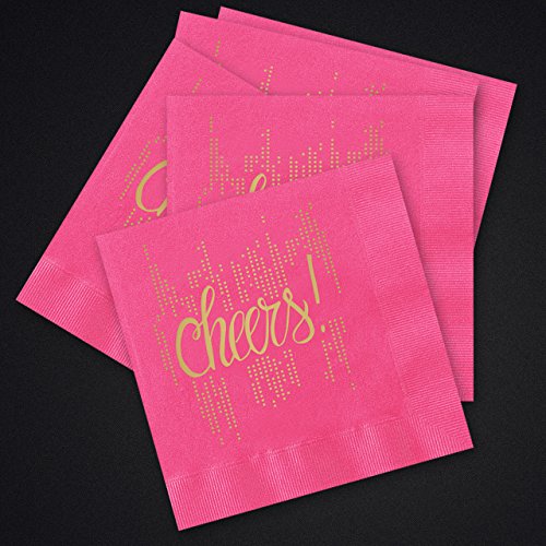 -. Title : Bubbly Cheers Beverage Cocktail Napkins - Set of 25 magenta pink paper napkins with gold foil