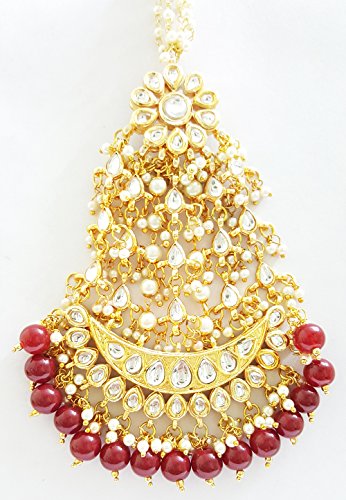 -. Feature : Heavy ethnic statement piece in gold tone, kundan , pearls & simulated rubies jhumar passa. It's part of our traditional imitation jewelry collection. / Perfect gift for girls / women. / Unique style, one of a kind and can be worn for any occasion / Length: 22 cm, Width: 9 cm, Weight: 62 gm. (Approx.) / Avoid contact with water and sprays.