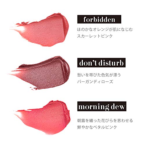 ■リップチーク フォービドン ヤシ油、ミツロウ、ヒマシ油、カカオ脂、ホホバ種子油、カルナウバロウ酸化チタン、酸化鉄、赤202、赤218、黄4 ■リップチーク ドントディスターブ ヤシ油、ミツロウ、ヒマシ油、カカオ脂、ホホバ種子油、カルナウバロウ酸化チタン、酸化鉄、赤104(1)、青1 ■リップチーク モーニングデュー ヤシ油、ミツロウ、ヒマシ油、カカオ脂、ホホバ種子油、カルナウバロウ、酸化チタン、酸化鉄、赤104(1)、赤201、黄4