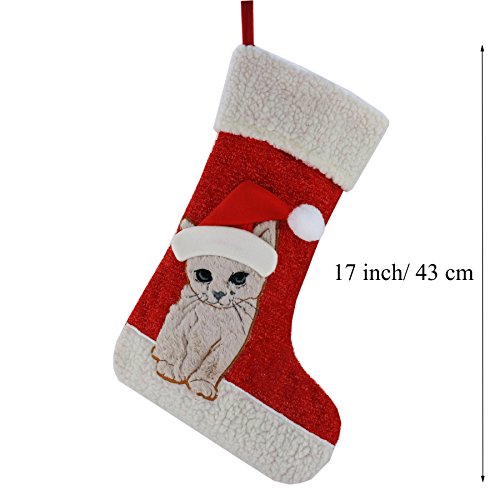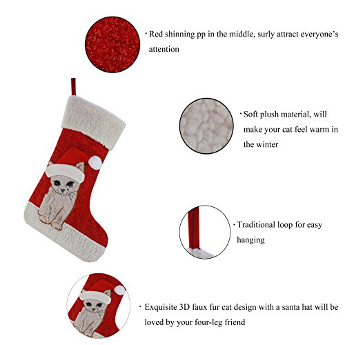 - In the middle of the stocking, there is red shining PP which create very modern feeling and a cute, vivid cat made of faux fur with a santa hat. The classic red and white color scheme is sure to please, and will work with nearly any Christmas decoration theme you choose, adding the festive atmosphere to your home.