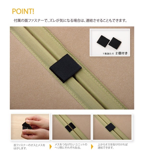 届いたユニット畳を床に置くだけで和のスペースが出来上がります。表生地には国産(九州産)のい草を使用しています。一本一本が太く、表皮が厚く繊維がキメ細かいので弾力性があり、耐久性に優れています。い草には空気の自然浄化作用、湿度の調節作用などがあります。また汚れにくく、使用するうちに黄金色に変化し、味が出ます。中材には10mmの硬わたを使用しておりますので適度なクッション性があります。裏地には滑りにくいウレタンフォームを使用しています。青森県尾ヒバの木から抽出した「ヒバエッセンス」をメーカー独自の技術で生地表面に加工しました。ヒバエッセンスにはヒノキチオールという、天然物物質としては極めて抗菌性の高い成分が含まれています(無加工品に比べ抗菌、防臭効果)。また軽量タイプなので、持ち運び、設置、片づけなども楽にできます。