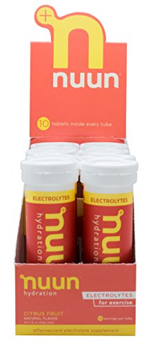 Nuun Hydration: Electrolyte Drink Tablets for Exercise & More. Citrus Fruit, Box of 8 Tubes (80 Servings). 1g Sugar, Low Calorie (10), Gluten Free, Vegan. Potassium, Magnesium, Sodium & Calcium