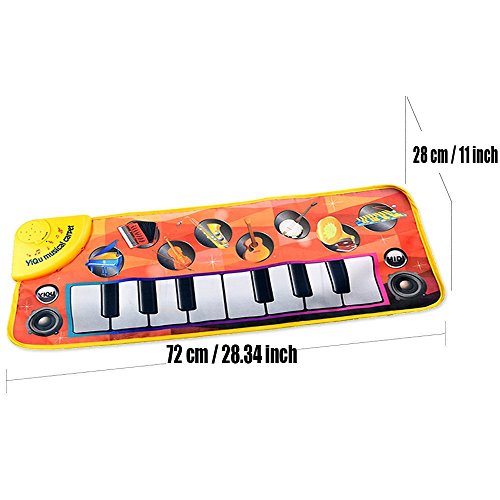 -. Feature : No smell, colourful and entertaining: - eco-friendly material, safe and no smell. The bright color can stimulate the baby's observation ability, multiple patterns to help children recognize different color, items, sounds and pictures. / Easy to use, great fun: - just crawl, touch or step on the mat with sound, power supply by 3xaa battery (not include), great fun for kids to practice and play with music. Children can go to touch, also can use feet to kick up; selected melody and selected instrument can be changed any time by pressing the desired melody key and desired instrument key. / Sound great, adjustable volume: - with 1 music mode key, 1 demo mode key, 8 kinds of musical instruments keys, 8 piano function keys, pleasing voice can stimulate the baby's hearing ability. One volume knob for adjustment as kids want. / Easy to clean, easy to fold up: - the piano mat made of detachable fabric, easy to clean ( note:can't clean it by water directly! Please clean it after taking off electronic components if you wanna do that ). / Perfect birthday gift, christmas present: - baby music floor piano mat is a great toy for baby touch sensitive and hearing training,also as good gift for kids. Material: pvc + electronic components; dimensions:72cm*28cm/28. 34 inch*11 inch; age: toddlers and up.