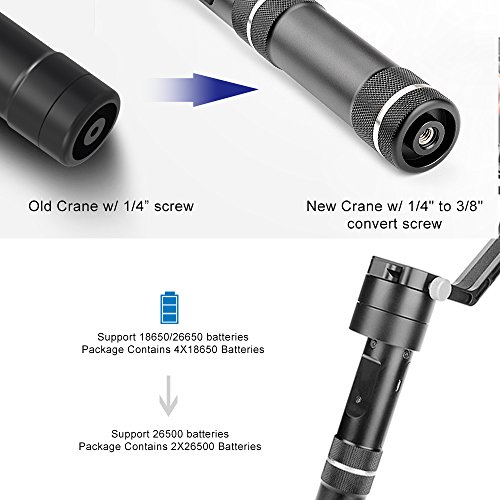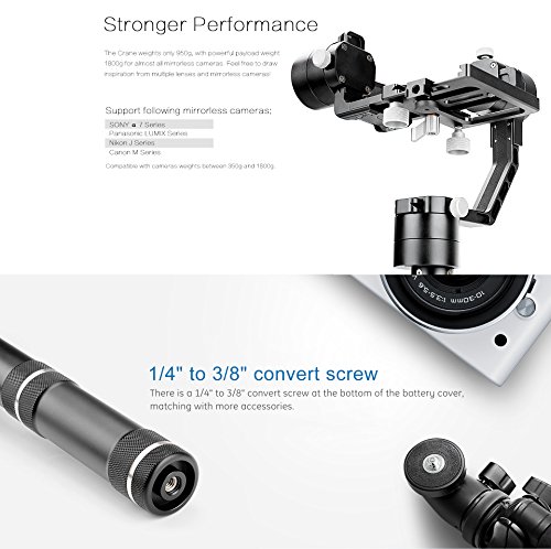 Weights only 2Lb/950g, compatible with Mirrorless Cameras weights between 0.77Lb/350g and 3.96Lb/1800g. With the 3/8" to 1/4" Screw Adapter at the bottom, the Crane can be matched with multiple filming accessories, i.e. tripod, extension rod, cupula, or hand held/worn to make delay shooting and create the effect of rocker arm.