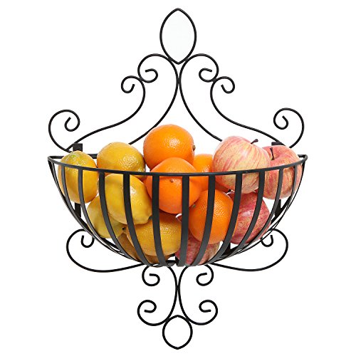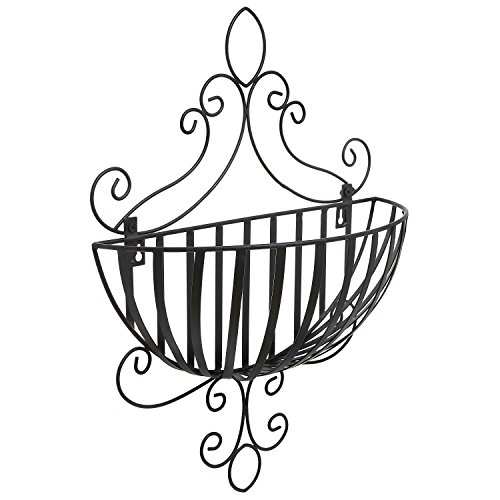 - Feature : Wall-mounted metal basket rack with an elegant scrollwork design and a classic black finish. / Provides storage space for fresh produce, newspapers, and other items, and can also be used to display decorative items. / Easy to attach to any wall using appropriate mounting hardware (not included). / **Official MyGift® product includes multipurpose cleaning towel. Coco-fiber plant basket and other items not included.** / Approximate Dimensions (in inches): 16.25 W X 21.5 H X 7 D.