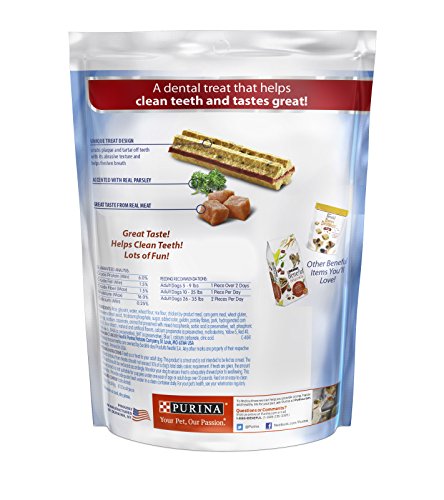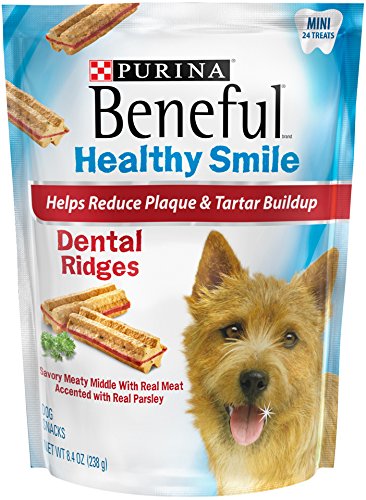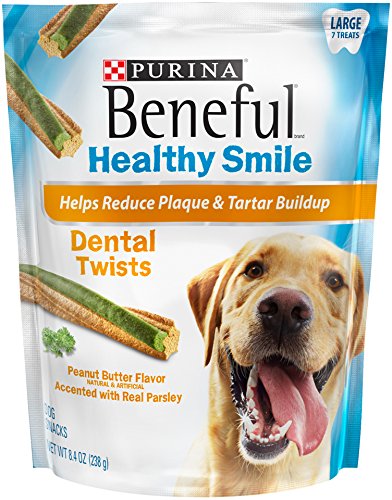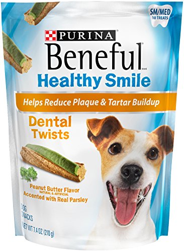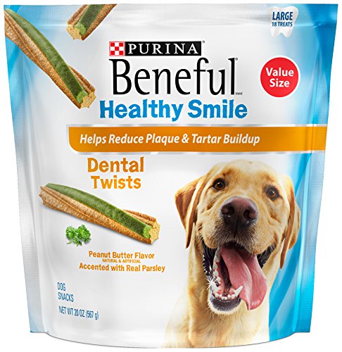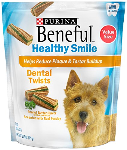 Beneful Healthy Smile Twists help reduce plaque & tartar buildup in a dental treat your dog will love! While your dog is enjoying the savory meaty middle accented with real parsley, they will also be helping to clean their teeth! Its a deliciously wholesome way to help care for your dog's teeth!Feature