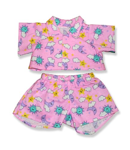 -. Feature : Pink teddy bear pajamas / suns, moon and cloud P.R.Int fabric / fits 15 inch plush / 2 piece outfit