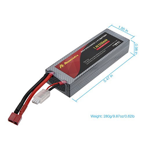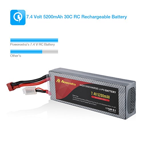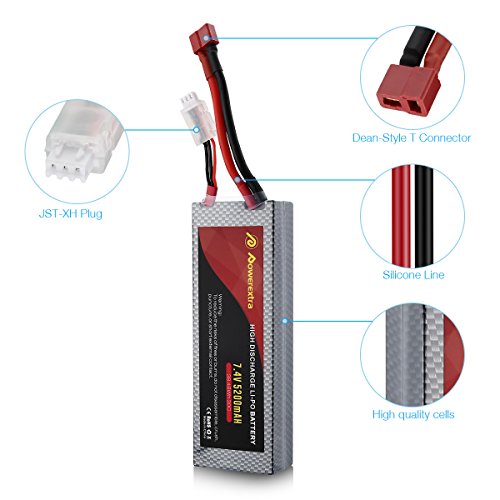 Studio : Powerextra Publisher : Powerextra Binding : Toy Product Description Powerextra 2 Pack 7.4V 5200mAh 30C Dean-Style T connector Lipo battery Capacity(mAh): 5200mAh Voltage(V): 7.4V Discharge Rate (C): 30C Max Burst discharge Rate (C): 60C Configuration: 2S1P Net Weight(dev.20g): 9.87Oz Size:5.47*0.98*1.85inch/pc Connector Type:Dean-Style T Connector Compatible with: RC airplane, helicopter, car, truck, boat, drone, FPV, Skylark m4-fpv250, Mini Shredder 200, Indy250 plus mojo 280, Qav250, Vortex and Emax nighthawk 250 (Only if the voltage, dimension and the plug match, then it will fit). Notice: (1)For the RC battery, only if the voltage and the plug match, then it will fit. (2)To double make sure safety, please have a check first whether the battery surface is alright when you get it and whether the voltage is normal before using. (3)If the new battey won't hold a full charge or loss the charge very quickly in short time, please use Balance Charger to charge and recycle several times first. 0