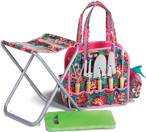 -. Feature : Includes cultivator, trowel, transplanted, weeder, hand rake, watering can mister, garden stool, kne / Easy wipe clean laminated exterior / Large center storage hold plants and supplies / Convenient elastic corded / Foldable aluminum framed padded stool