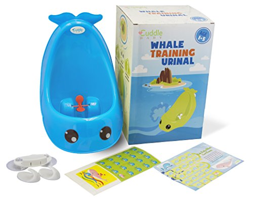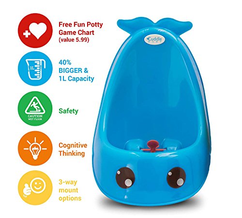 The Cuddle Baby boy training urinal is designed to encourage and motivate our little man towards getting potty trained. The fun spinning water wheel entertains and keeps your child focused during training. It also comes with a free game where your boy is rewarded with a sticker every time he uses the urinal. The removable urinal is lightweight, portable and easy to clean. Include powerful suction cups, adhesive wall hooks and a screw-type mounting plate (screws not included) to allow you to adjust the height of the urinal and attached it to any bathroom walls. It is made of high quality PP and PVC material. It is environmental friendly, non-toxic and odorless.