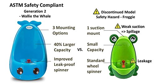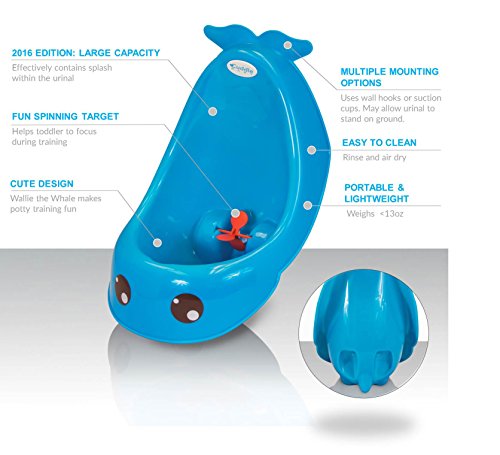 ReleaseDate : 2017-10-04 Studio : Einstein Associates LLC (Baby) Publisher : Einstein Associates LLC (Baby) Binding : Baby Product Product Description Product Details: We have discontinued our old Froggy urinal and replaced it with our 2nd Generation Whale Urinal. Our concern was on user’s safety and risk of fall/injury due to Froggy’s frequent leakage problem below the wheel and spillage issues. Wallie the whale is now made 40% larger with an increased capacity of 4.2 cups and an improved water spinner that is 100% leak proof. Its smooth curvature bowl is also designed to better contain urine splash. Unlike Froggy that relies solely on its suction-type wall mount; causing spillage whenever its suctions fail, Wallie the Whale offers 3 different secured mounting options each to serve varying wall-types and needs. Additional base supports also allow users to stand Wallie on the floor where preferred.